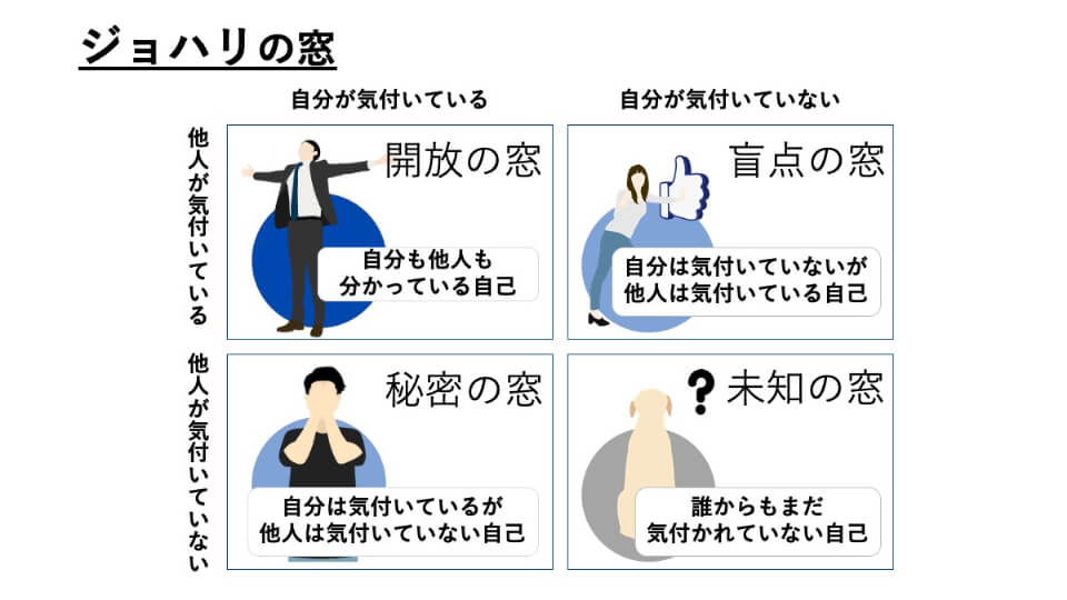 家族や友人に聞く場合は「ジョハリの窓」を活用してみましょう。ジョハリの窓とは、自分の特徴を以下4象限のマトリックスにまとめたものです。