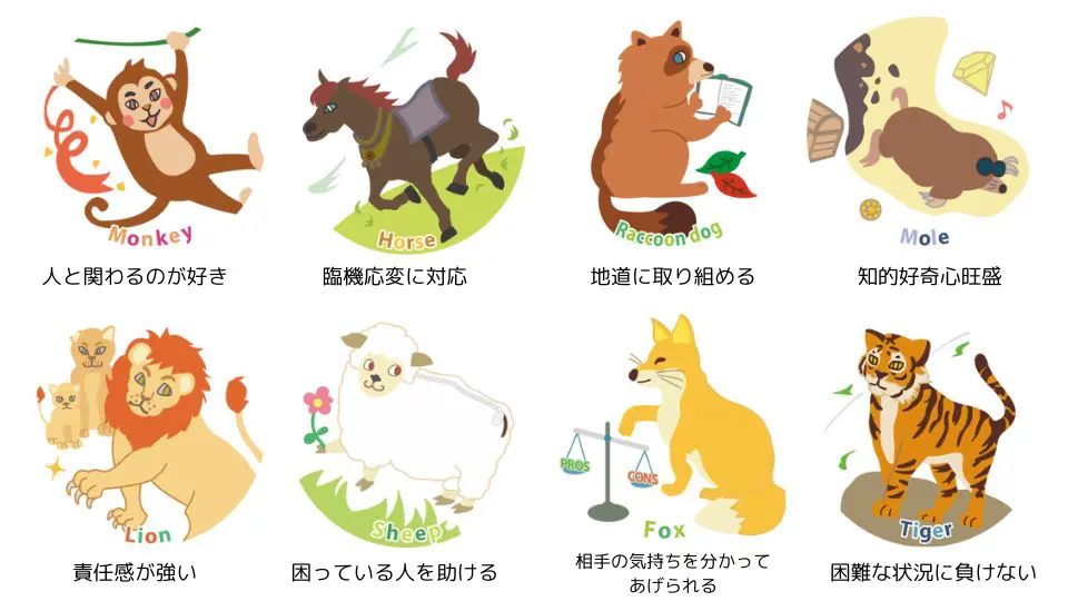 そのようなときは、OfferBoxの適性分析ツール「AnalyzeU+」がおすすめです。「AnalyzeU+」は累計100万人の診断結果にもとづいて分析してくれる適性診断ツールで、28項目の診断結果で自分を分析できます。また、組織の中での役割を8つの動物に分類しており、得意分野や組織における立ち位置などもわかります。