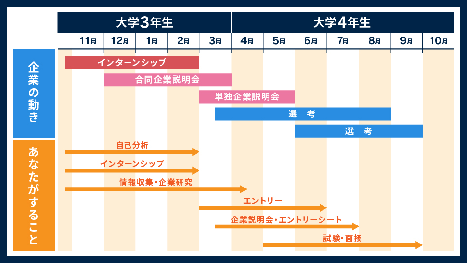 1つ目のやるべきことは、就活の時期・選考の流れをつかむことです。