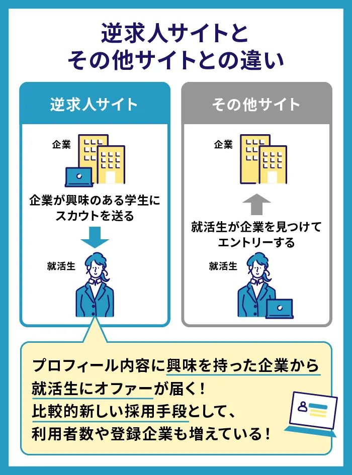 新卒向けの逆求人サイトとは、プロフィールを登録することで、プロフィール内容に興味を持った企業から就活生にスカウトやオファーが届くサイトのことです。