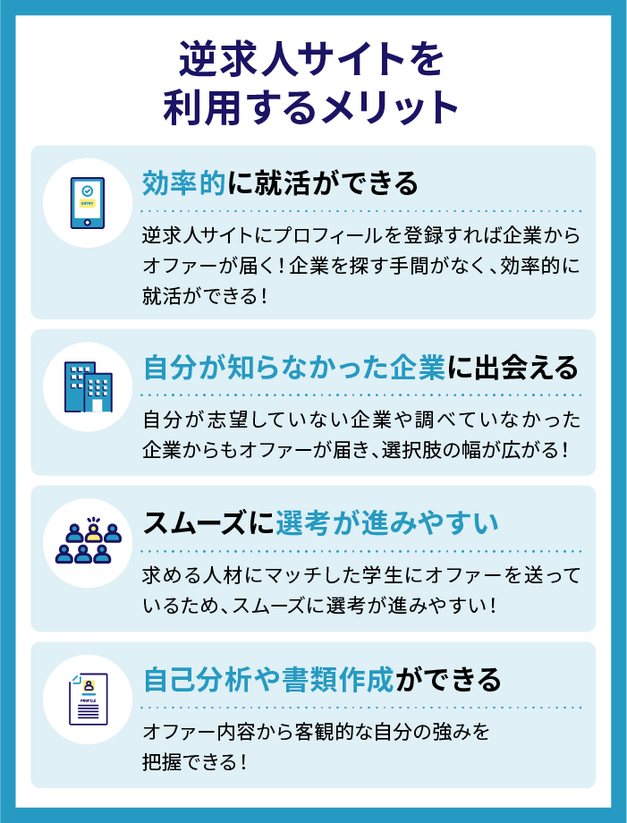 新たな就活方法や採用手段として利用者数や登録企業も増えており、今まで見ていなかった業界・職種のオファーが来る可能性もあるため、自分に合う企業を見つけやすいことから、自己分析のためにも逆求人サイトを利用する就活生もいます。