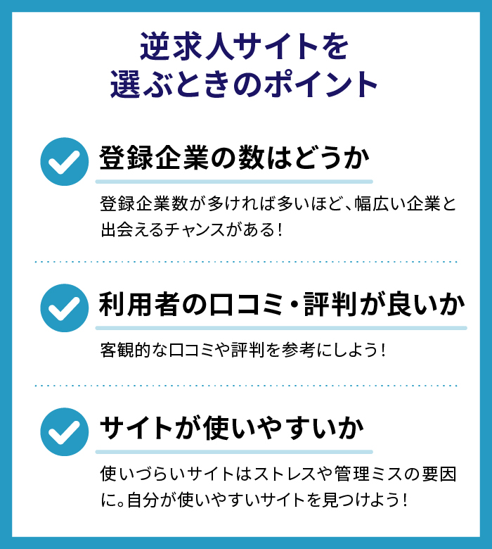 就活で役立つ逆求人サイトを選ぶポイントを確認していきましょう。