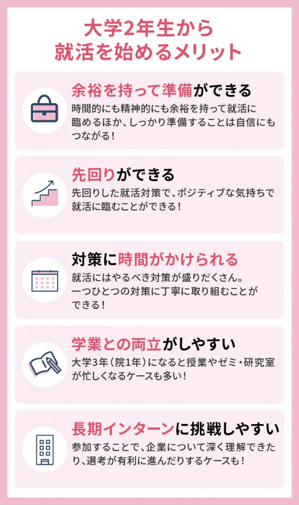 大学2年生という早い段階で就活を始めることで、他の学生に対して優位になることができるだけでなく、学生生活にメリハリをつけて将来に備えることができるでしょう。
