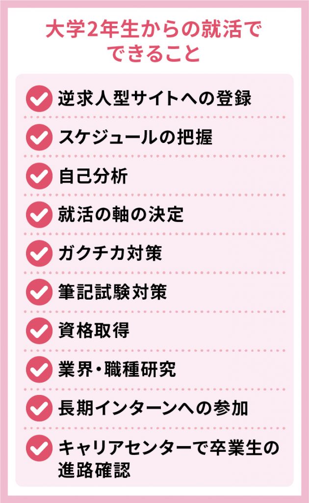 大学2年から就活に取り組む場合、具体的にできることはどのようなことなのでしょうか。