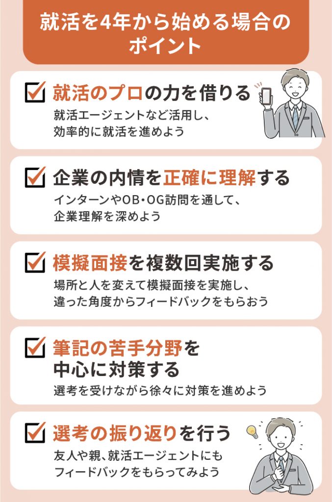 就活全般においてスピード感を意識しつつ、選考対策の質も担保できるように、就活を4年から始める場合のポイントを確認していきましょう。
