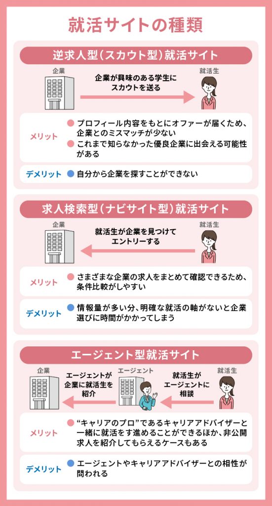 就活サイトには3つの種類があり、それぞれメリットとデメリットがあります。また、同じ種類のサイトでも登録している企業が異なることや、使えるサービスなども異なります。