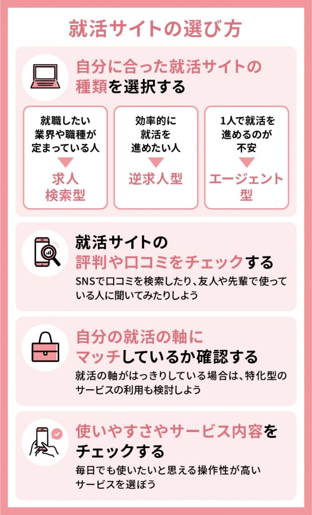 前章では就活サイトの種類をご紹介しましたが、ここからは就活サイトの選び方について紹介していきます。