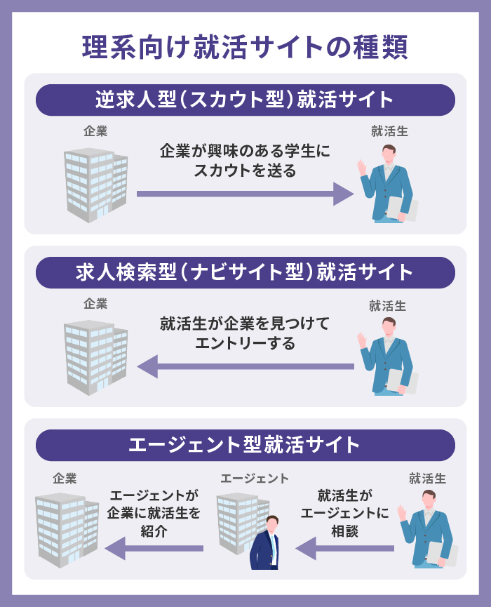 理系学生の利用が想定される就活サイトは、大きく以下の種類に分類されます。