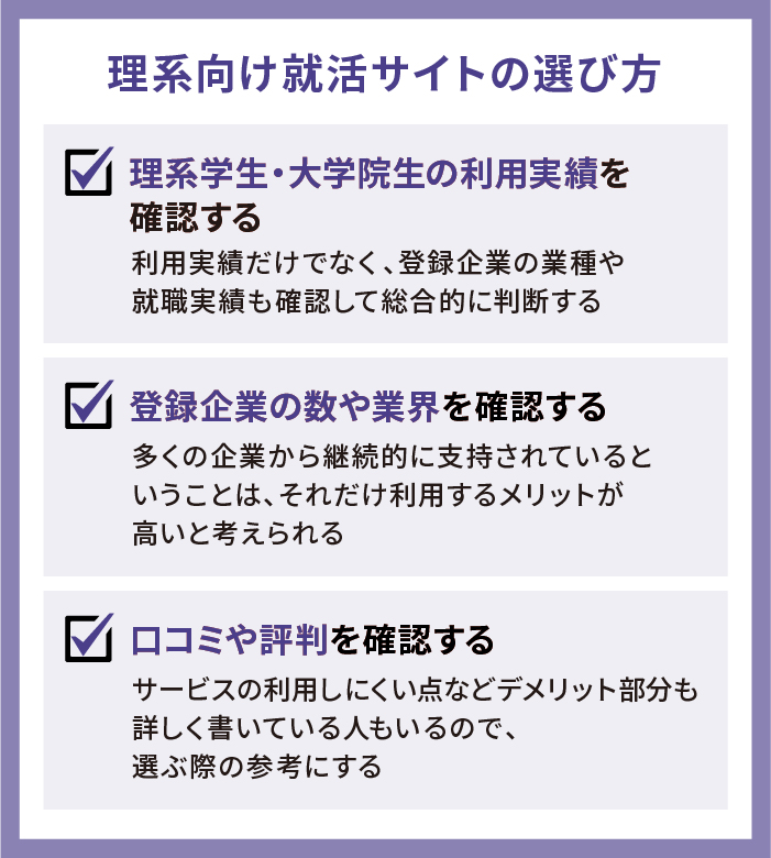 そこで、ここでは理系学生向けの就活サイトを選ぶ際に最低限確認すべきポイントを解説していきます。