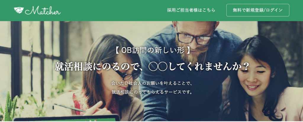 | Matcher | マッチングアプリ | 所属大学に関係なくOB訪問ができる | 志望動機や志望度を深めて内定獲得につなげたい人 |