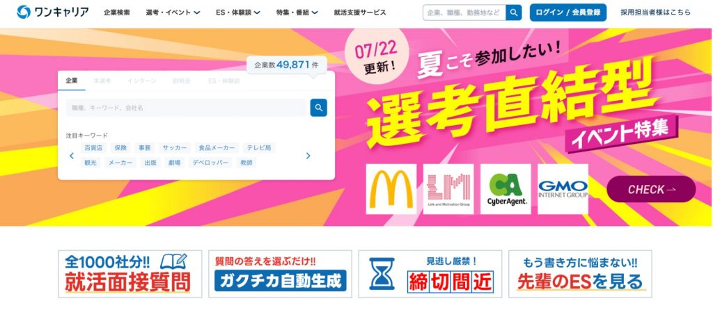 | ワンキャリア | 選考に関する情報のすべてが閲覧可能 | 選考体験談や内定者のESを見て対策を立てたい人 |