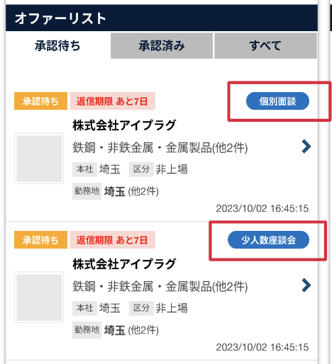 また、企業のオファー送信数は限られているため、学生一人ひとりのプロフィールを確認したうえで送信しているのが特徴です。オファー内容も以下のように、個別面談や少人数座談会、インターンなどさまざまです。