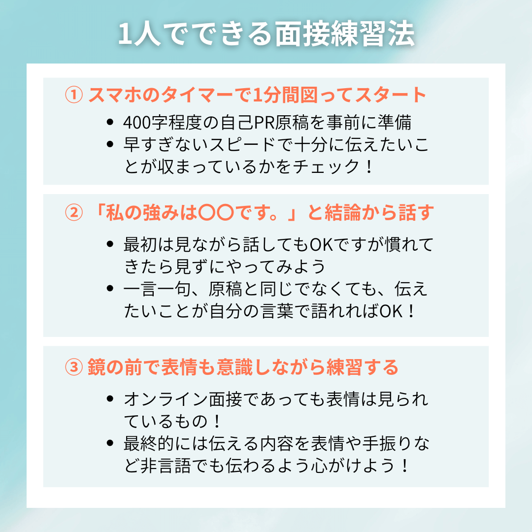 先週までで作成した自己PRを、「1分で話す」練習をしてみましょう。