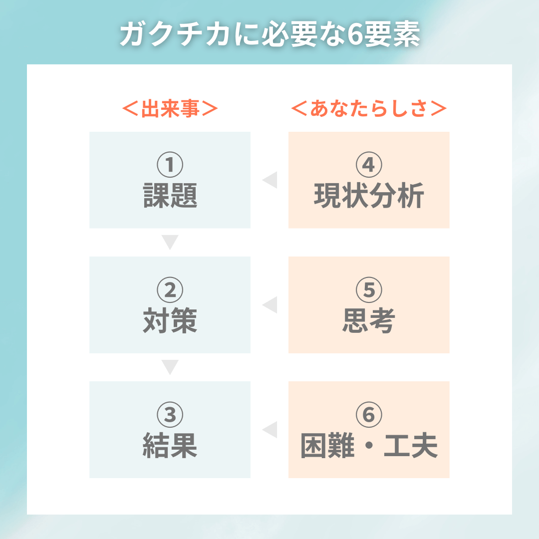 サークル、アルバイト、学業など、ご自身の経験を一つ思い浮かべ、この6つの要素に分解してみてください。