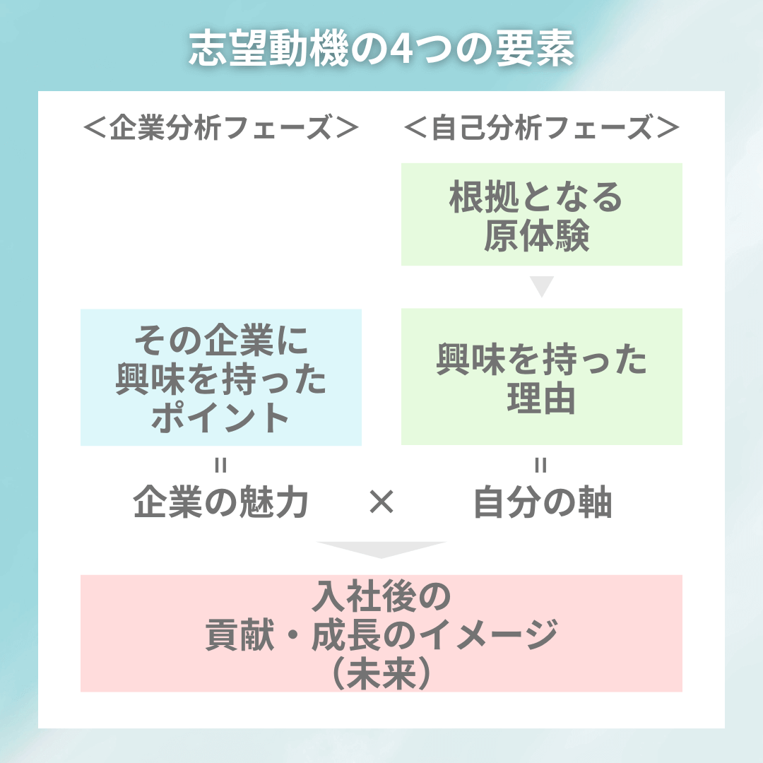 志望動機とは、「自己理解(あなたの想い・考え)」と「企業理解(企業の魅力)」の掛け算で成り立っています。