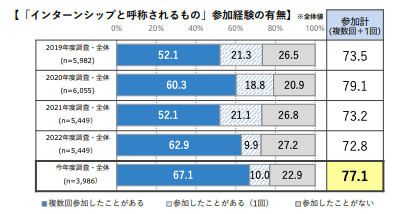 実際、内閣府の「学生の就職・採用活動開始時期等に関する調査」によれば、23卒学生のうち77.1%が参加しており、ほとんどの学生がインターンに関心を持って行動している状況です。