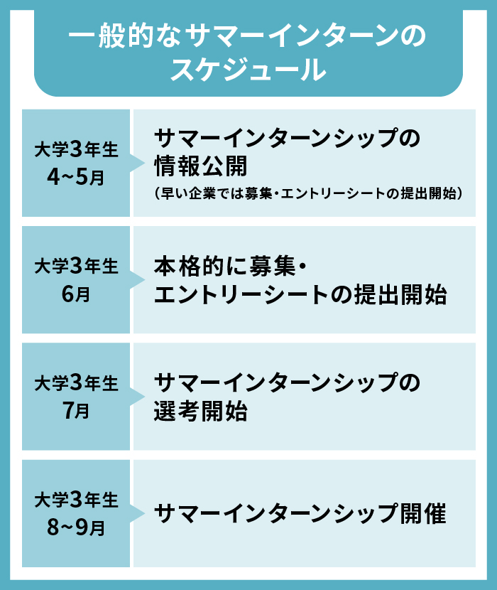 サマーインターンシップが開催されるのは8~9月頃ですが、参加者の募集や選考はそれより数ヶ月前から始まります。「参加しようと思ったら募集が締め切られていた…」という失敗を避けるため、早めの準備を心がけましょう。