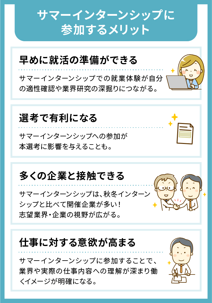 1つは、早めに就職活動の準備ができることです。サマーインターンシップは3月の情報解禁の半年以上前に開催されるため、そこでの経験が本選考に活かせます。
