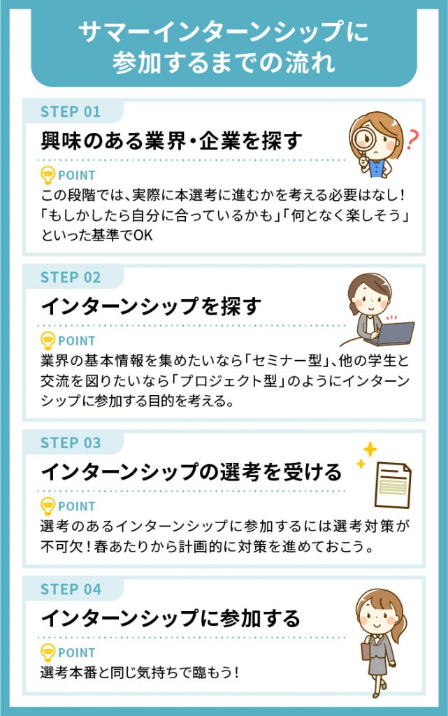 サマーインターンシップに参加するまでの流れは、大きく4つのステップに分けられます。「参加してみたいけど何から手をつけるべきか分からない」という方は、以下のステップで準備を進めていきましょう。