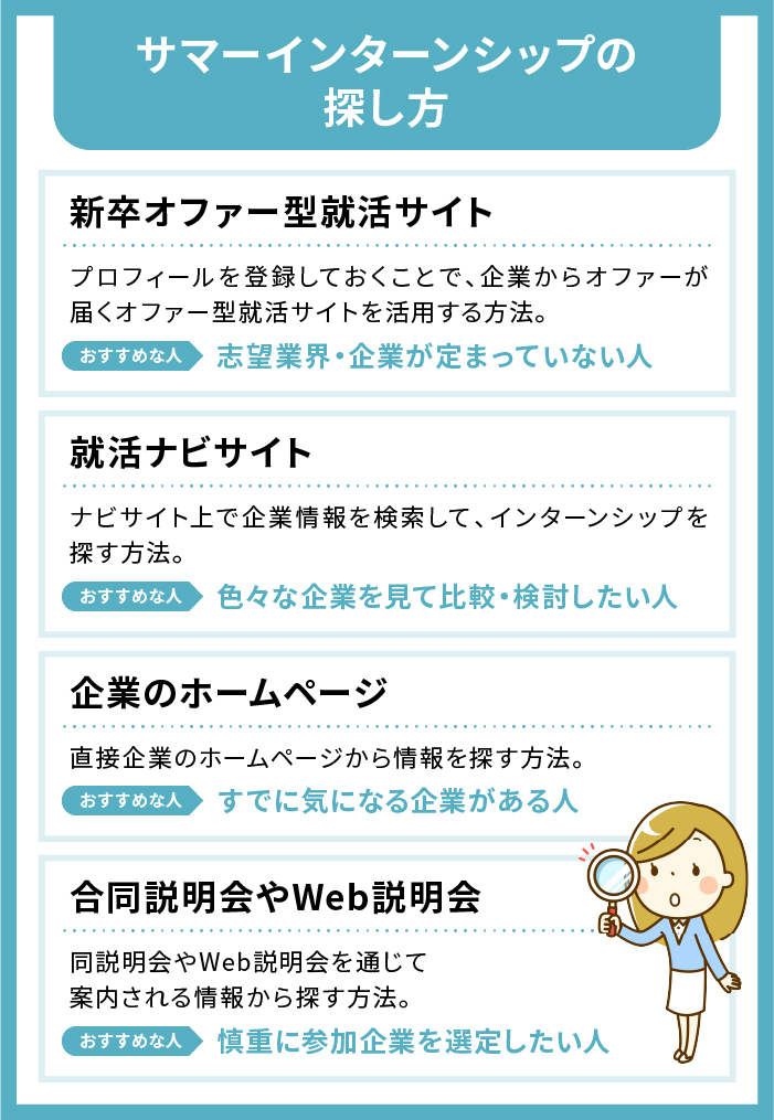 ここからは、実際にサマーインターンシップを探す方法を4つ紹介します。自分の目的に合ったサマーインターンシップを効率的に見つけるため、複数の方法をうまく組み合わせて探していくのがおすすめです。