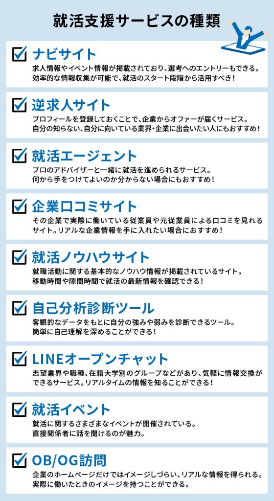 就活サービスとは、就職活動をサポートしてくれるサービスです。企業探しから業界・企業研究、自己分析、エントリーシートの作成、面接対策など、選考に向けて必要な準備をサポートしてくれます。