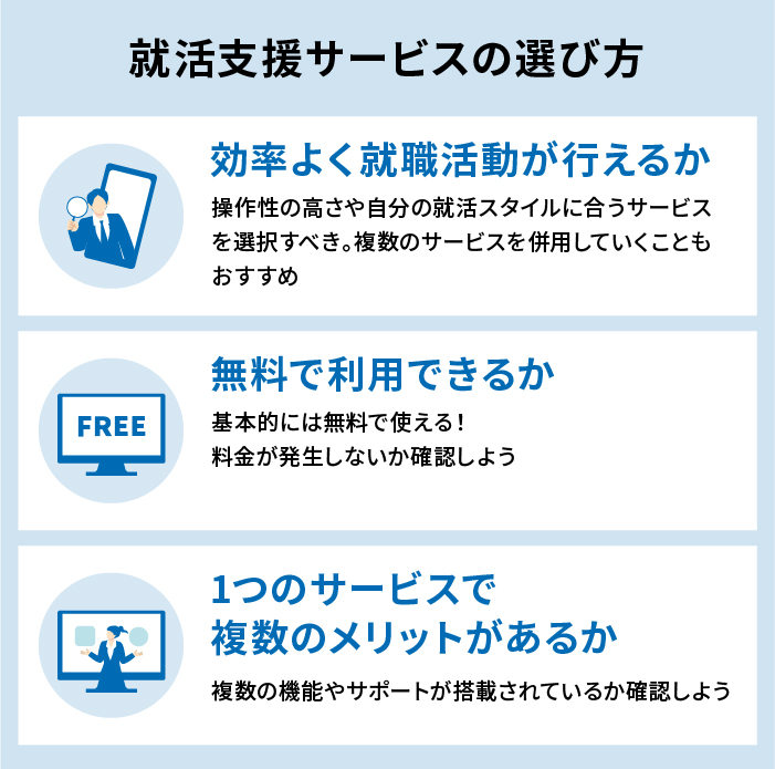 利用する就活サービスの数があまりにも多すぎると、アカウントと情報の管理が煩雑になります。1つのサービスで複数のメリットがあるものを選ぶのが、効率的に就活をすすめるポイントです。。