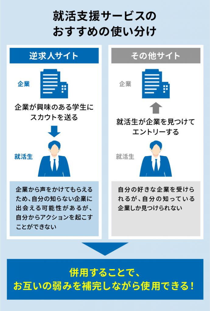 例えば逆求人サイトや就活エージェントでは、ナビサイトに載っていない、もしくは見つけづらい優良企業に出会えるチャンスがあります。就活サービスごとに異なるメリットがあるので、うまく併用して就職活動に活かしましょう。