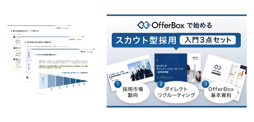 また、これからの新卒採用においてダイレクトリクルーティングを検討していきたい方向けに「OfferBoxで始めるスカウト型採用入門3点セット」という資料も用意しました。最新市場動向と、ダイレクトリクルーティングの基礎資料、OfferBoxの基本資料を3点まとめてダウンロードしていただけます。本記事とあわせてご活用ください。