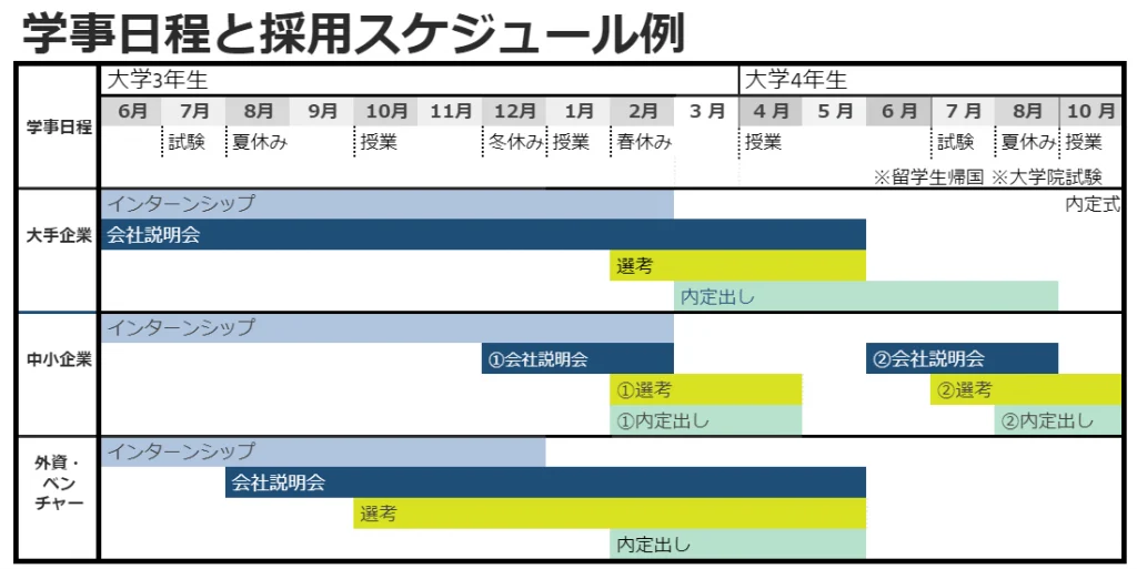 2027年卒の新卒採用スケジュール例を「大手企業」「中小企業」「外資系企業・スタートアップ」の3種類に分けて解説します。