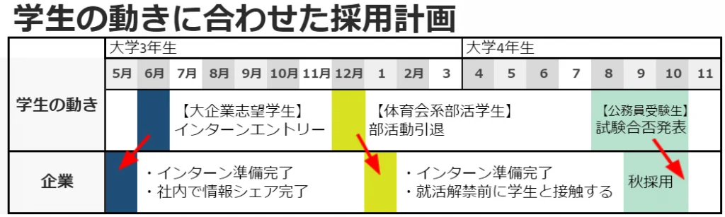採用したい学生の動きを確認して採用計画を立てましょう。学生は、毎年行われる就活のイベントに応じて動きます。