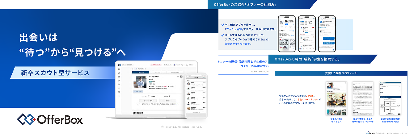 ※126卒学生の登録数 2025年9月現在 ※2OfferBox2025年卒利用実績データより※OfferBox経由で就職した学生が、OfferBox内で選択している第一志望の業界と最終的に就職した業界の一致率 ※32026年卒 有効回答数833件(2024年11月調査) i-plug調べ ※4OfferBox2025年卒利用実績データより※プロフィール入力率80%以上の学生より※構成比の数値は、小数点以下第1位を四捨五入しています。