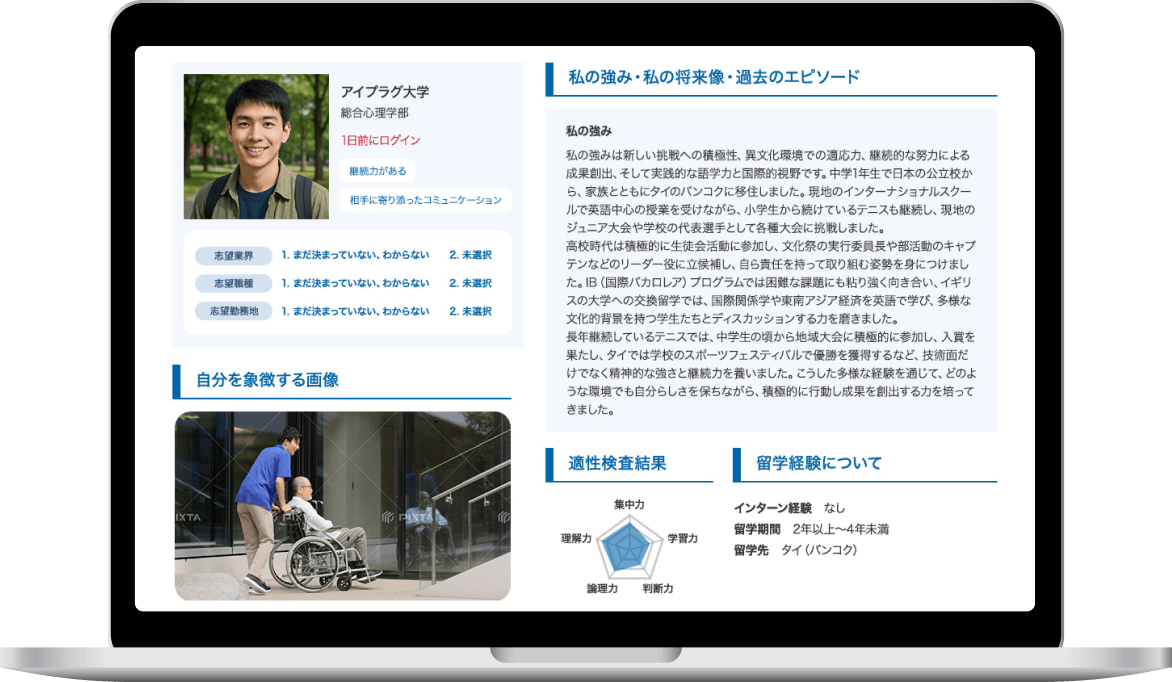 画一的な資料からは伝わりきらない学生のパーソナリティ・価値観など「らしさ」が現れるよう、プロフィール項目量を豊富に用意しており、動画・画像・研究資料などのデータを自由に登録できます。