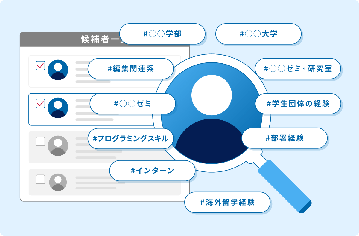 さらに約30の検索項目から、条件にマッチする学生だけをピンポイントで採用することができ、ミスマッチを減らせます。