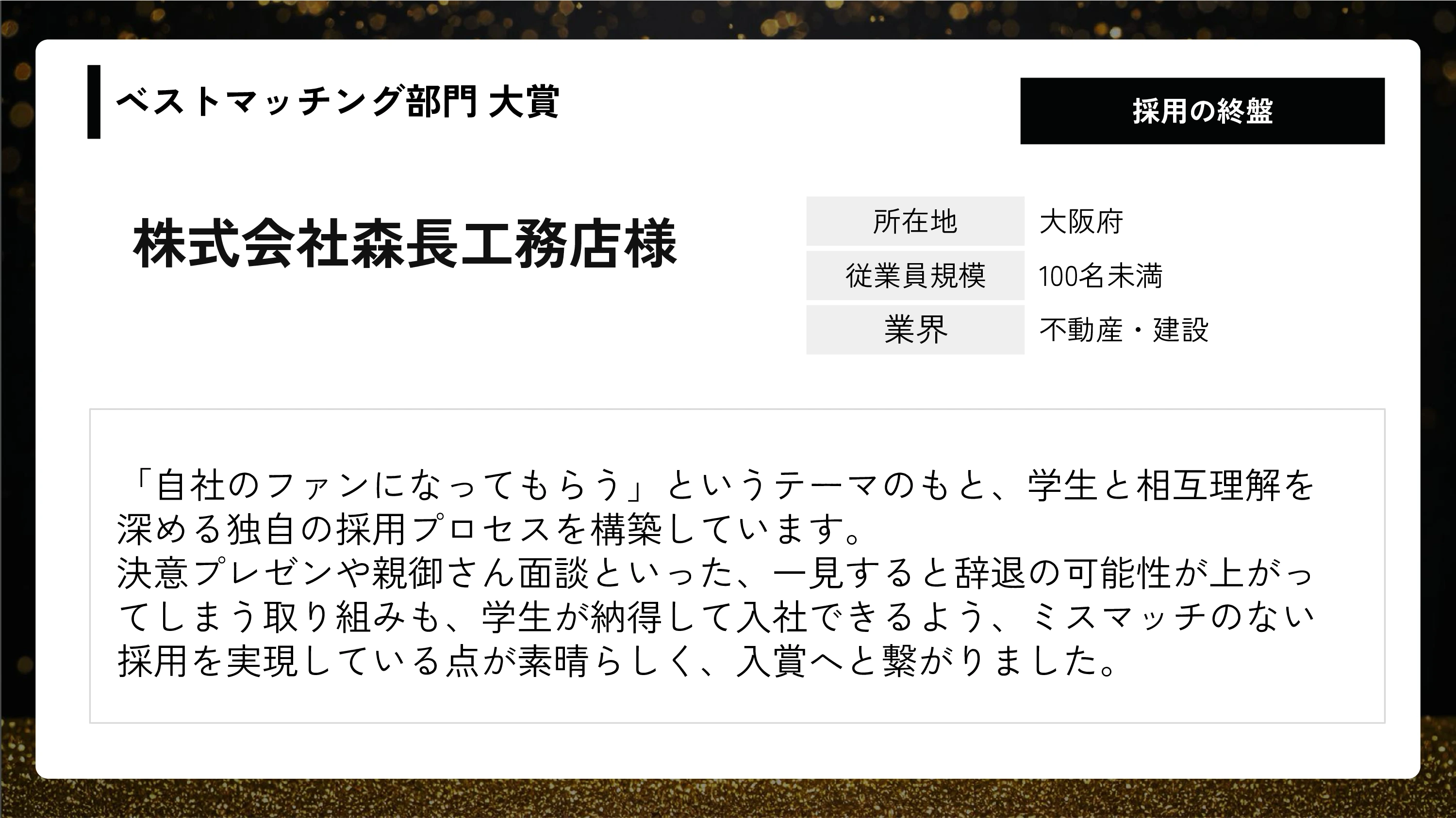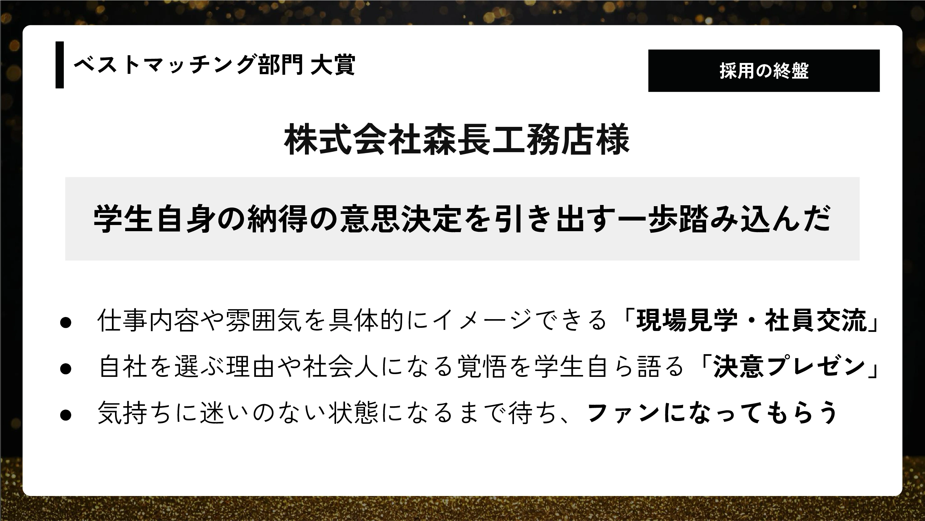 株式会社森長工務店様は「採用の終盤」がテーマです。学生が入社を決めるタイミングでの「納得を生む決意」についてお話しいただきました。具体的には「ファンを作ること」や「学生が実施する決意プレゼン」についてです。