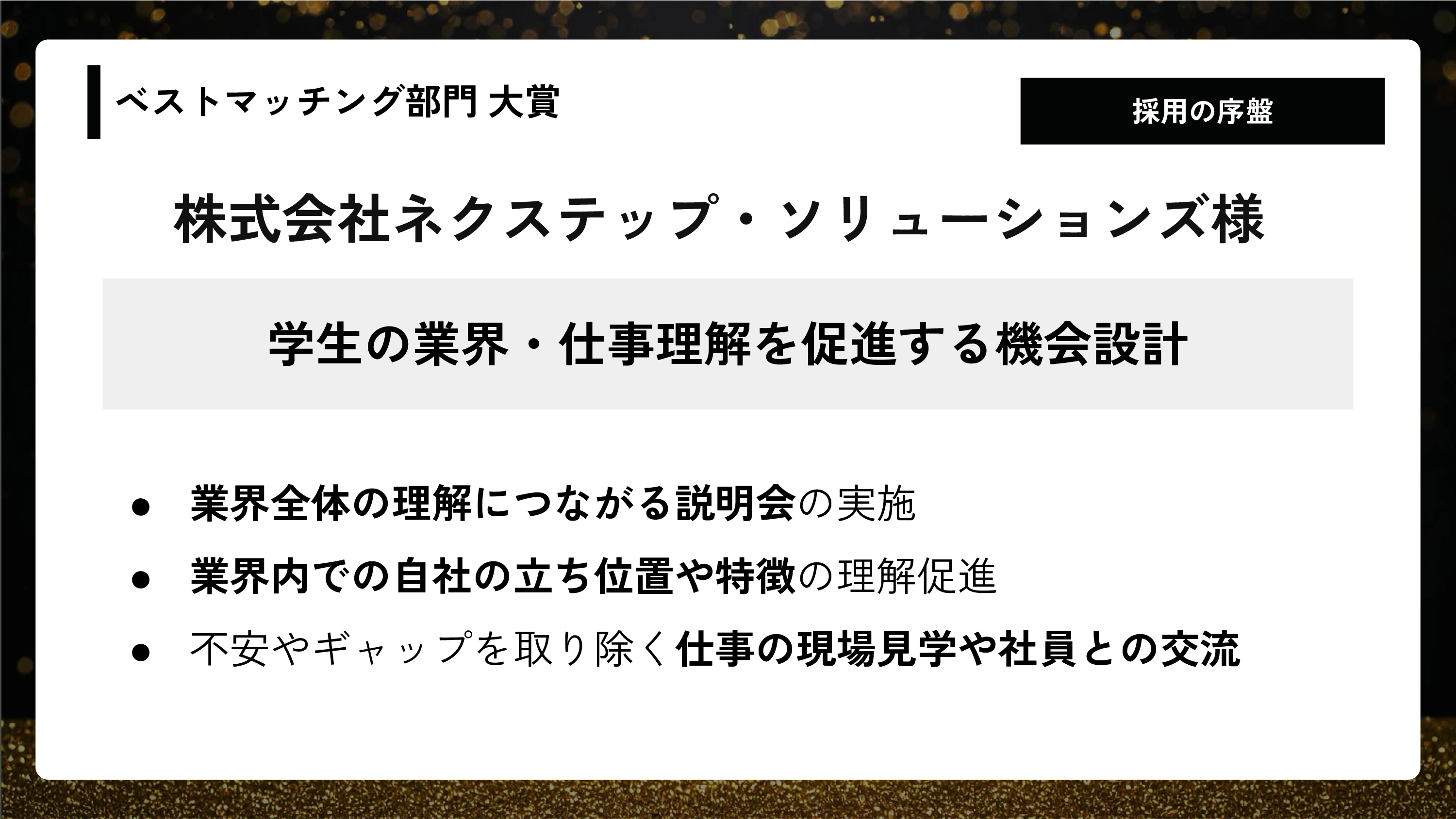 株式会社ネクステップ・ソリューションズ様は「採用の序盤」をテーマに学生と出会ったタイミングにおいて、工夫されたことを話しました。具体的には、自社だけでなくIT業界全体の理解促進などです。