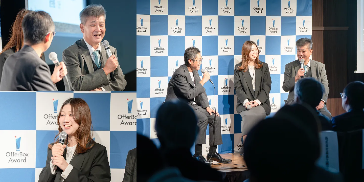 「『納得就活』を叶える企業の挑戦」をテーマに、各社のミスマッチをなくすための工夫がパネルディスカッション形式で話されました。アスペックの田川様は、自らOfferBoxのオファーを送り、初回の面談を実施しています。社長自ら採用活動をする背景や、若手社員も巻き込んだ採用活動について。レックスの今川様は、4回実施する面談についてや学生との寄り添い方などについて話しました。お二人の採用や学生への熱い想いが伝わる素敵なパネルディスカッションでした。