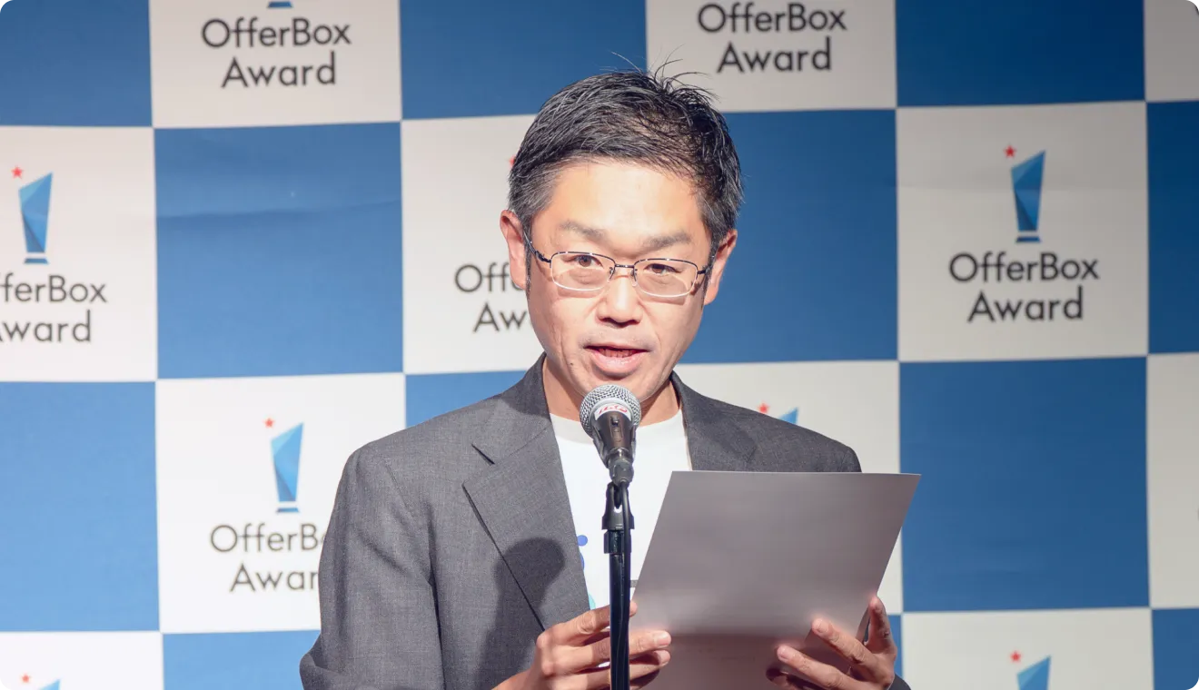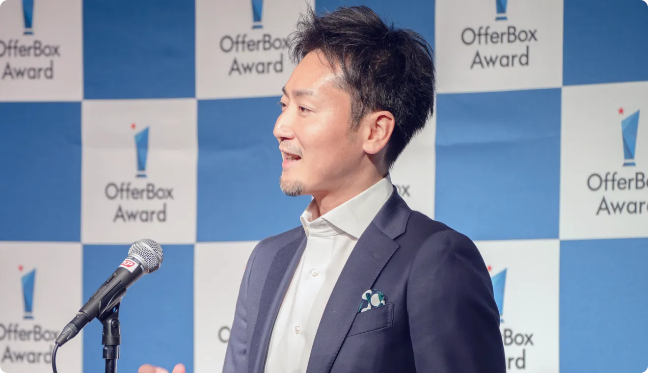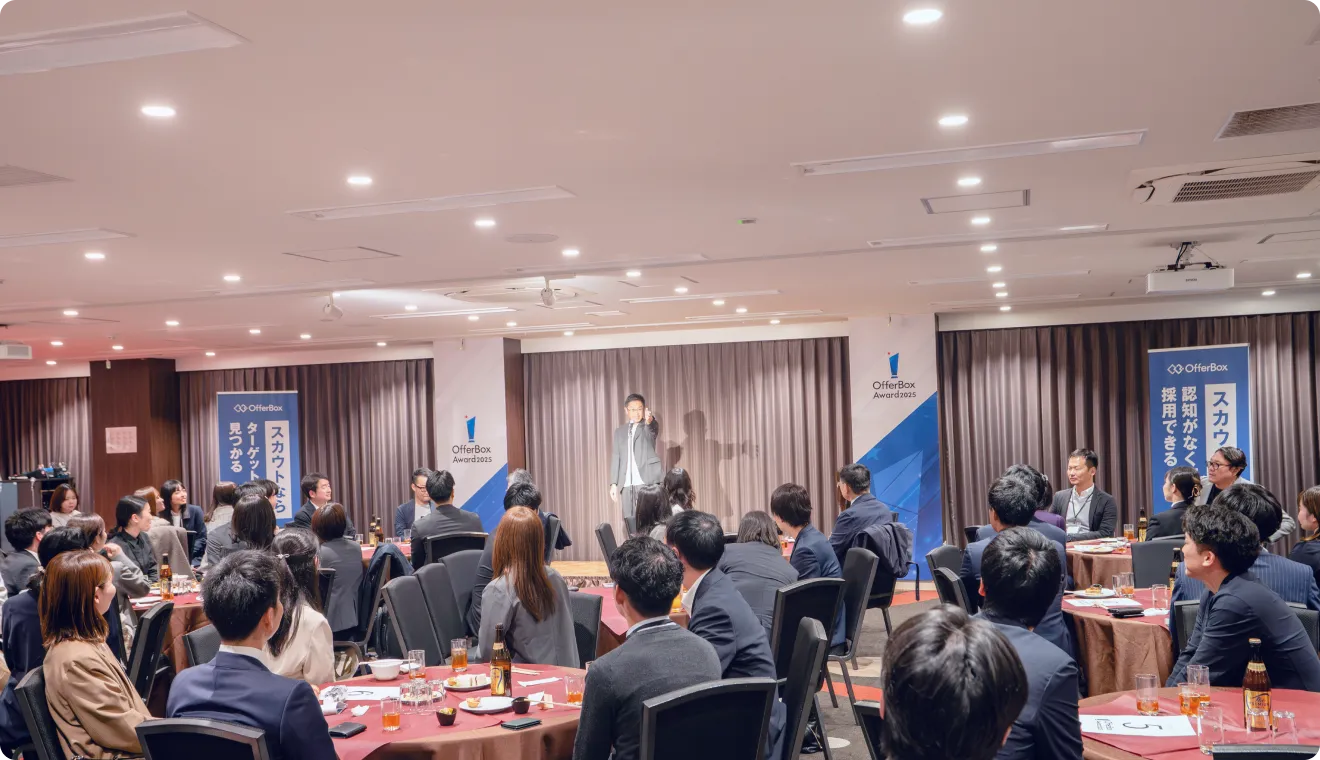 「OfferBox Award 2025」はi-plug COO直木による開会の挨拶からスタート。日頃の感謝とともに「OfferBoxは『採用』がゴールでなく、OfferBoxを通じて学生と企業が納得したうえで就職活動を終えることを目指しています。本日はそんなOfferBoxの思いに共感し、体現してくれている皆様に会えることを楽しみにしていた。」とコメントしました。
