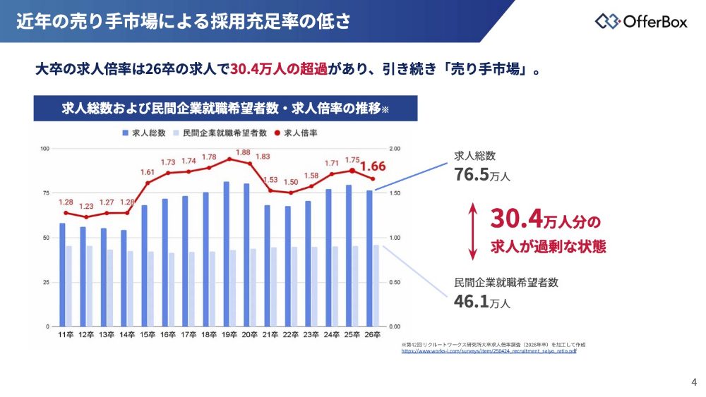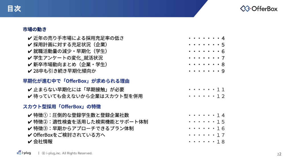 また、売り手市場や早期化が進む中でどのように学生と早期接触を図るかをスカウト型採用の観点から紹介しています。