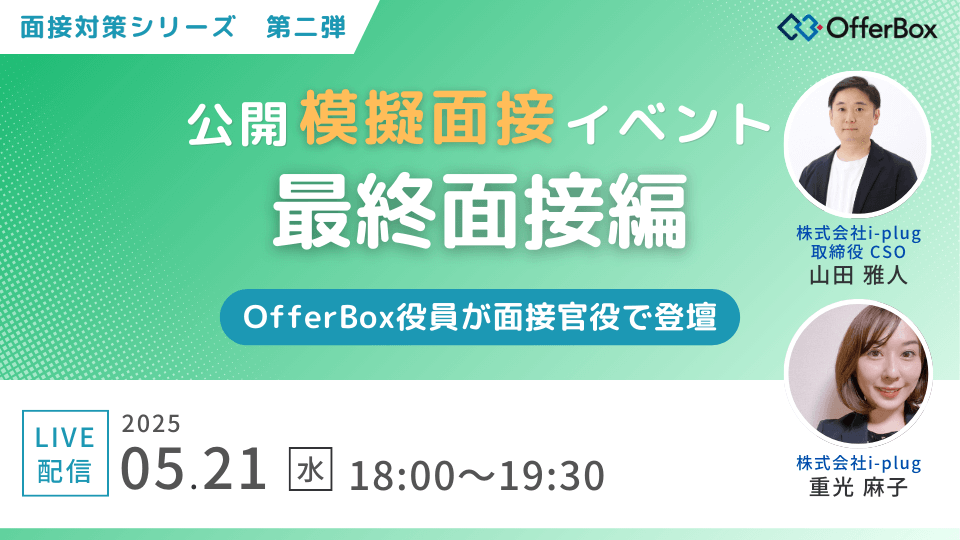 それを踏まえて、OfferBox運営会社(株式会社i-plug)の役員が面接官役、OfferBoxの23卒社員が学生役として登壇し、模擬面接を見ていただきながらリアルなイメージが持てる内容になっています。