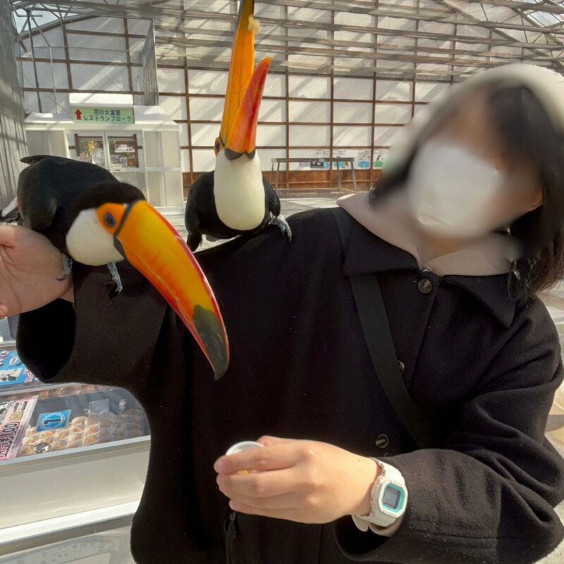 これは,掛川花鳥園でオニオオハシという鳥にエサをあげている様子です。私はインコ5羽を飼育するほどの鳥好きで,このときはオニオオハシが2羽も肩に乗ってくれて夢のような時間でした。